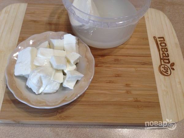 4. Половинку большого шарика моцареллы нарежем на кусочки.