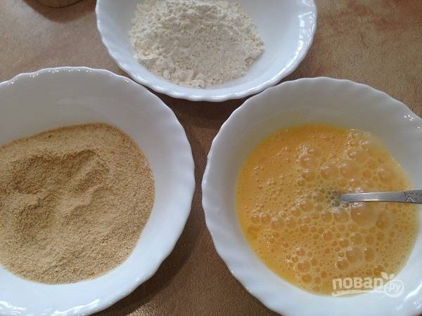 6. Насыпаем в отдельные миски муку, сухари, а в третьей взбиваем 3 яйца.