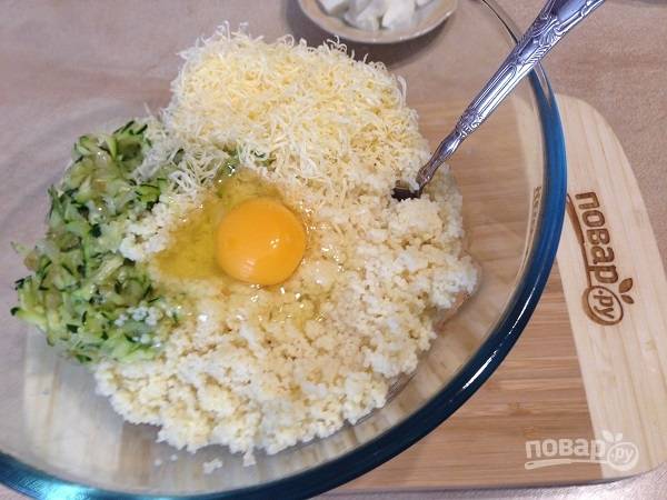 5. Смешаем остывший кускус и цукини, твердый сыр, натертый на мелкой терке, яйцо. Масса не должна получиться жидкой! Если у вас она слишком мягкая, можно добавить немножко муки.