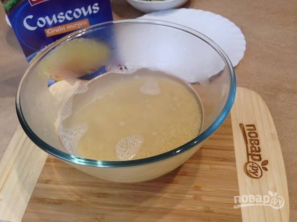 1. Кускус насыпаем в глубокую миску, добавим щепотку соли, заливаем двумя стаканами кипятка (или по инструкции на вашей упаковке). Накрываем и оставляем минут на 10-15.