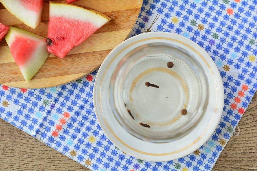 На дно простерилизованной банки выложите специи — душистый перец и гвоздику.