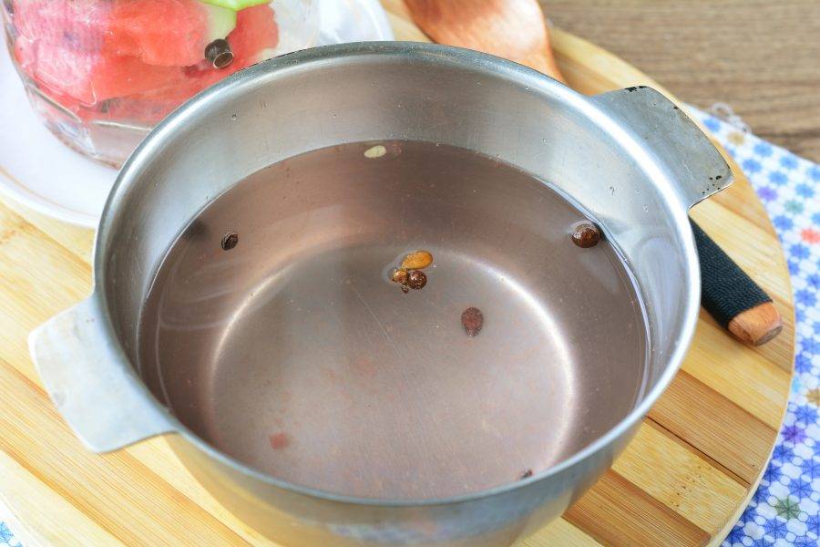 Залейте арбузы кипятком, оставьте на 15 минут, прикрыв крышкой.