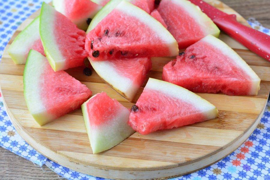 Сложите кусочки арбуза в банки. Если плохо будет вмещаться, можете срезать края в виде треугольничков.