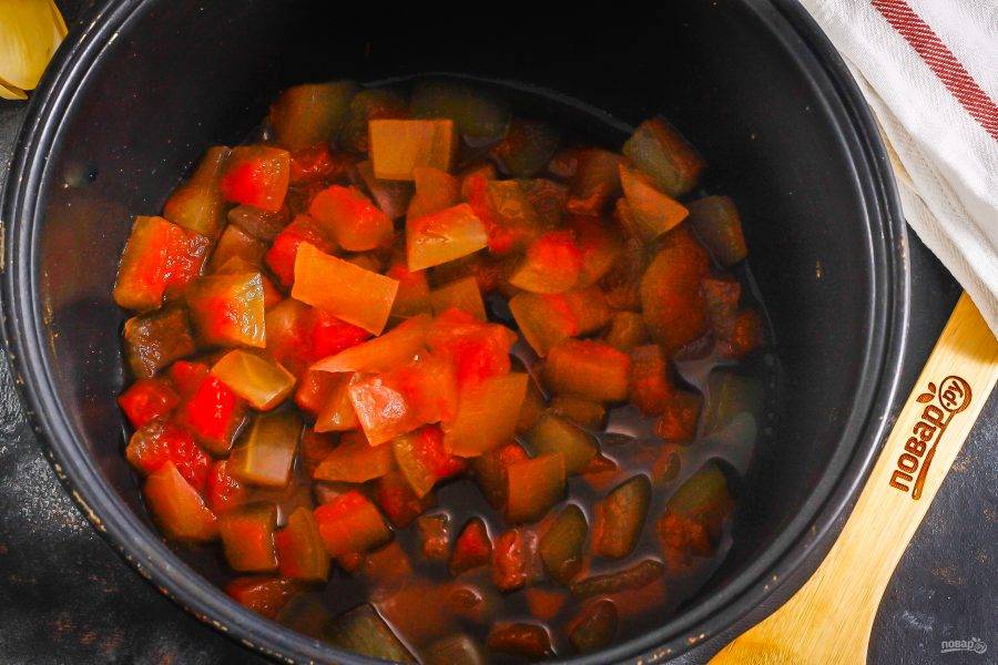 Нарежьте их порционными кубиками толщиной примерно 2 см. Выложите в чашу мультиварки и активируйте режим "Тушение" на 20 минут. За это время нарезка выпустит сок, слейте его.