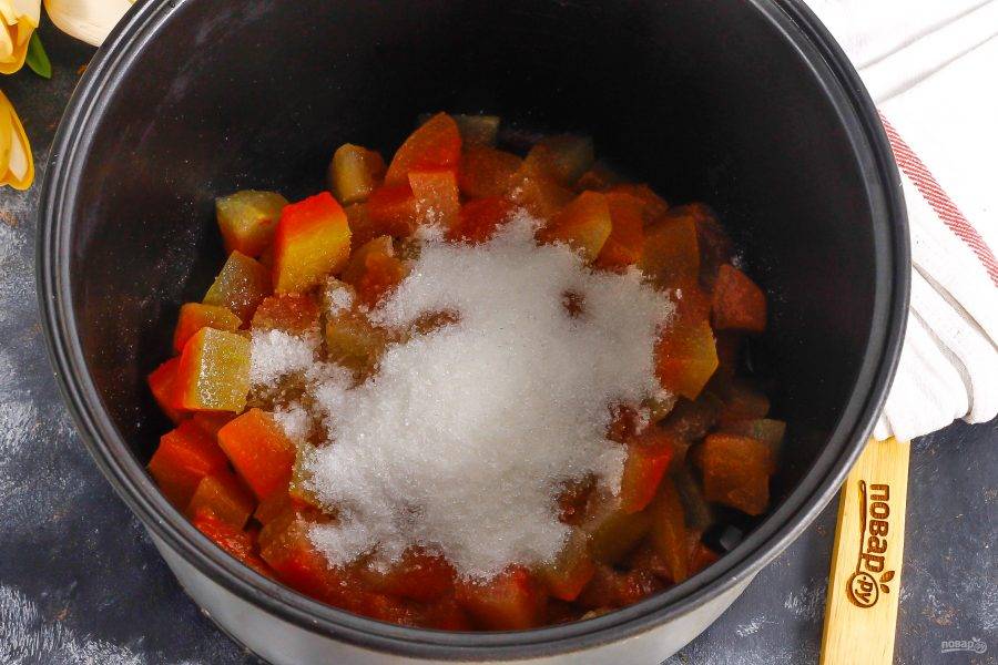 Затем добавьте сахарный песок и лимонный сок. Активируйте режим "Тушение" еще на 15-20 минут, перемешав содержимое чаши. После указанного времени выключите мультиварку и извлеките чашу. Остудите примерно 1 час, чтобы нарезка впитала в себя сироп.