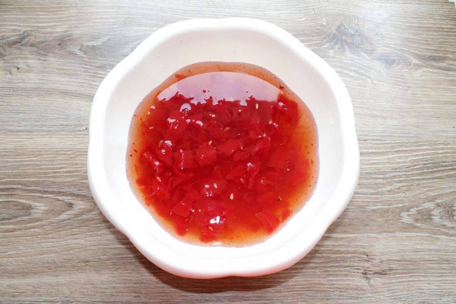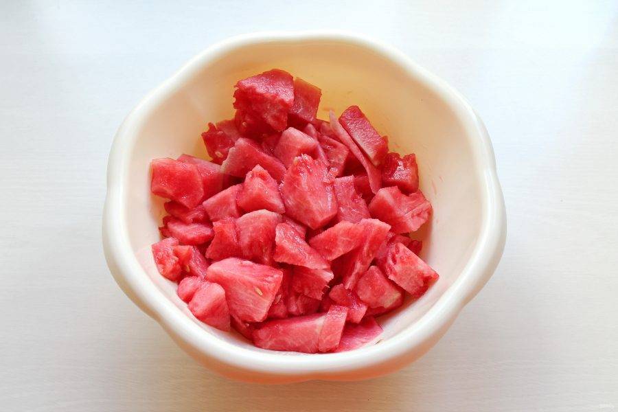 Арбуз помойте, срежьте корки, порежьте на кусочки, удаляя семечки. Порежьте и выложите в миску.
