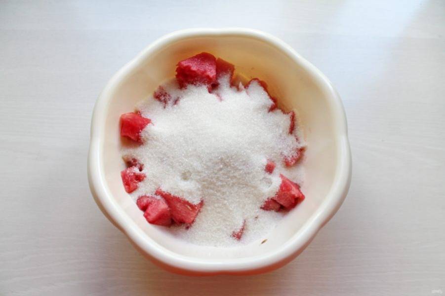 Всыпьте в миску с арбузом сахар и перемешайте.