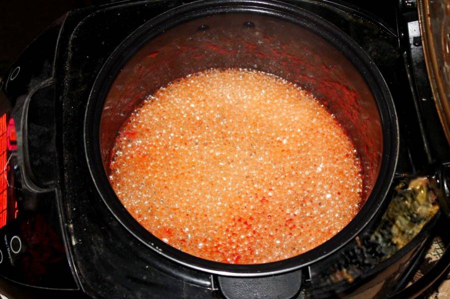 Верните варенье в чашу мультиварки и варите еще 10 минут в режиме "Тушение", не закрывая крышкой, перемешивая.