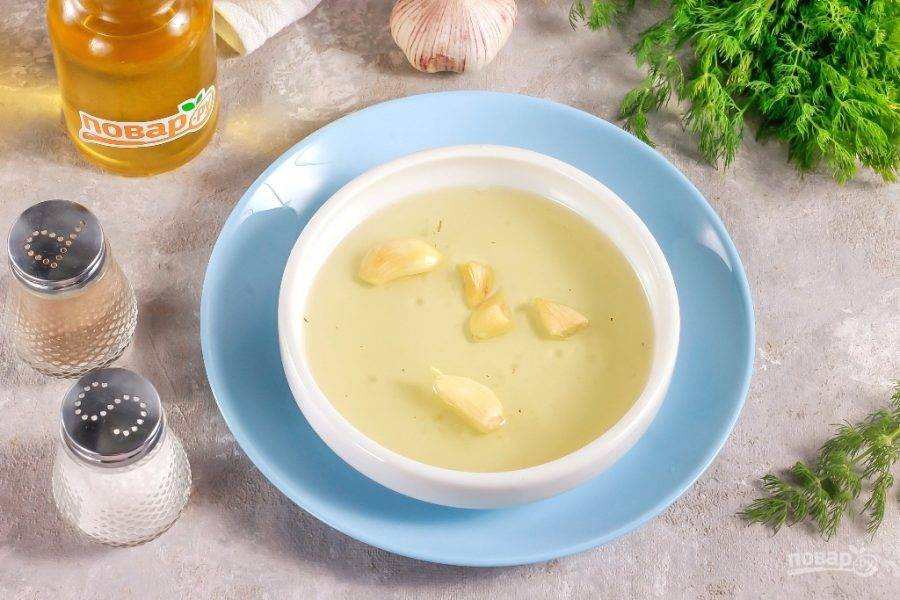 Очистите чесночные зубчики и промойте в воде. Выложите их в пиалу и залейте растительным маслом. По желанию можно нарезать зубчики слайсами, чтобы они быстрее отдали свой аромат маслу.