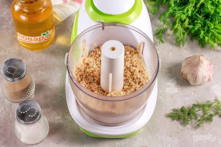 После этого разломите сухарики на части и выложите их в емкость измельчителя. Пробейте все в течение 3-4 минут в мелкую ароматную крошку.