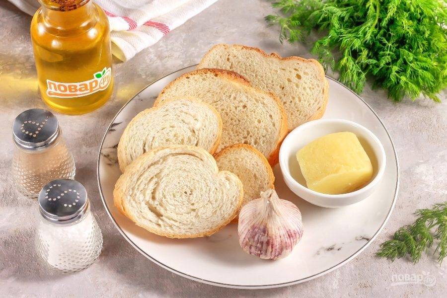 Подготовьте указанные ингредиенты. Можно использовать любой вид белого хлеба: багет, батон, тостовый хлеб или "кирпичик".