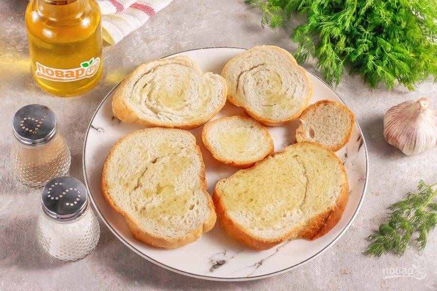 Спустя 1-2 часа сбрызните ломтики багета или батона приготовленным чесночным маслом и поместите их в духовку, разогретую до 90-100 градусов на 20-30 минут. Желательно не сильно подрумянить сухарики, а просто высушить.