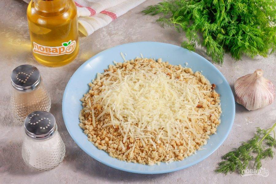 Пересыпьте крошку в тарелку или глубокую пиалу, натрите на терке с мелкими ячейками сыр и аккуратно все перемешайте.