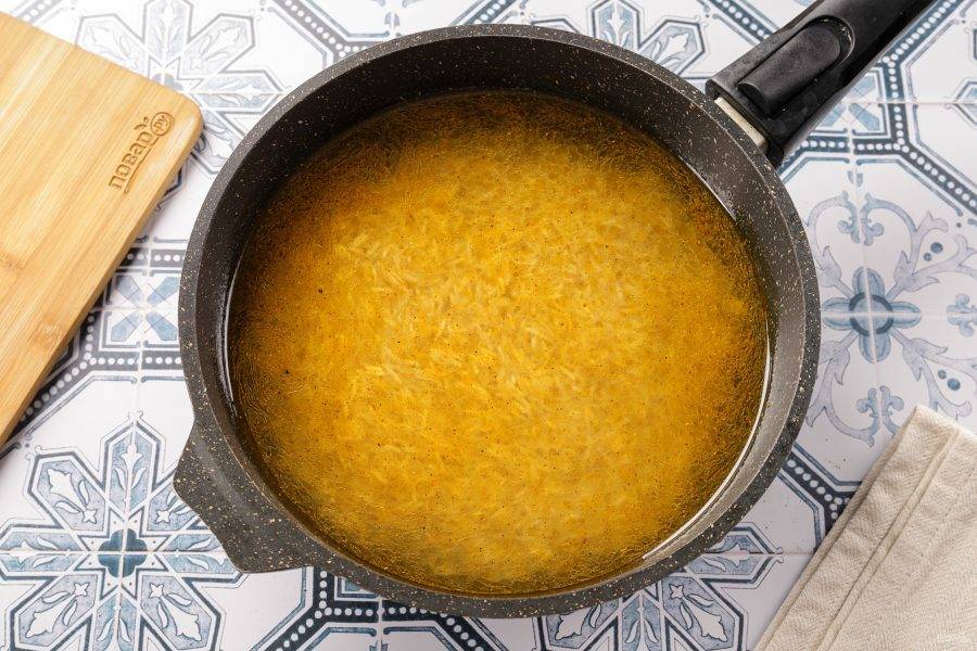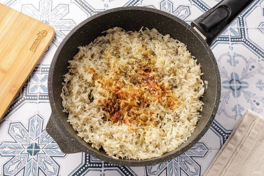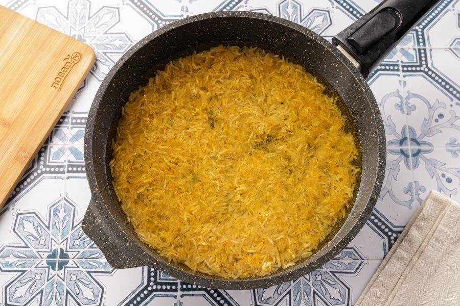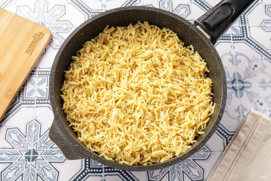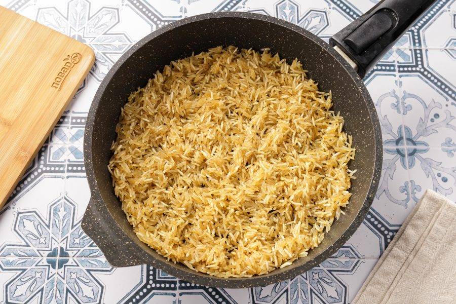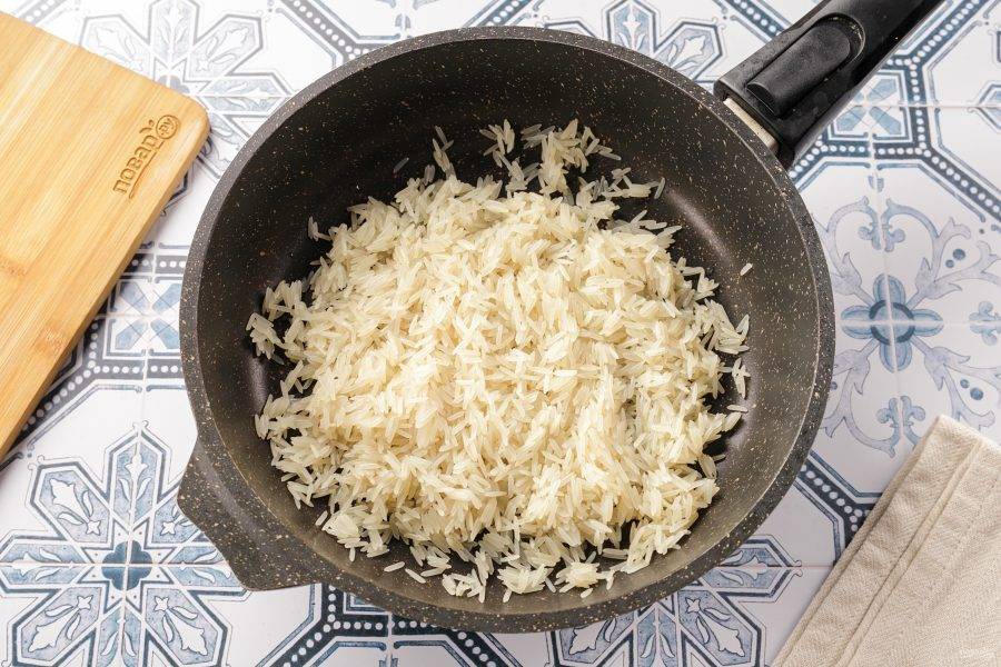 Убавьте огонь до среднего и, мешая, обжарьте рис. Сначала он побелеет и перестанет быть прозрачным, потом станет желтовато-золотистым.