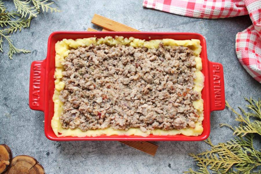 Форму для запекания смажьте растительным маслом и выложите чуть больше половины картофельного пюре. Распределите ровным слоем на бока и дно формы. Затем выложите мясной фарш и разровняйте, немного прижав.