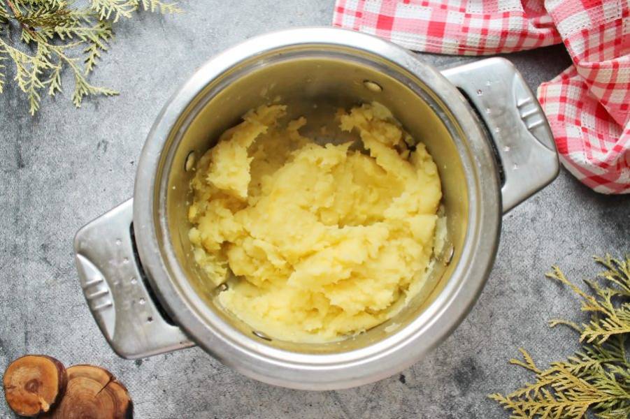 Картофель почистите и отварите в соленой воде до готовности. Отвар слейте. Картофель разомните в пюре. Добавьте сливочное масло. Затем перемешайте все до однородности. Влейте теплое молоко, перемешайте. Заройте крышкой и отставьте ненадолго в сторону.