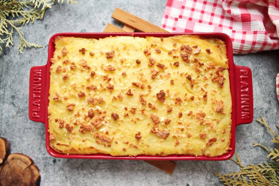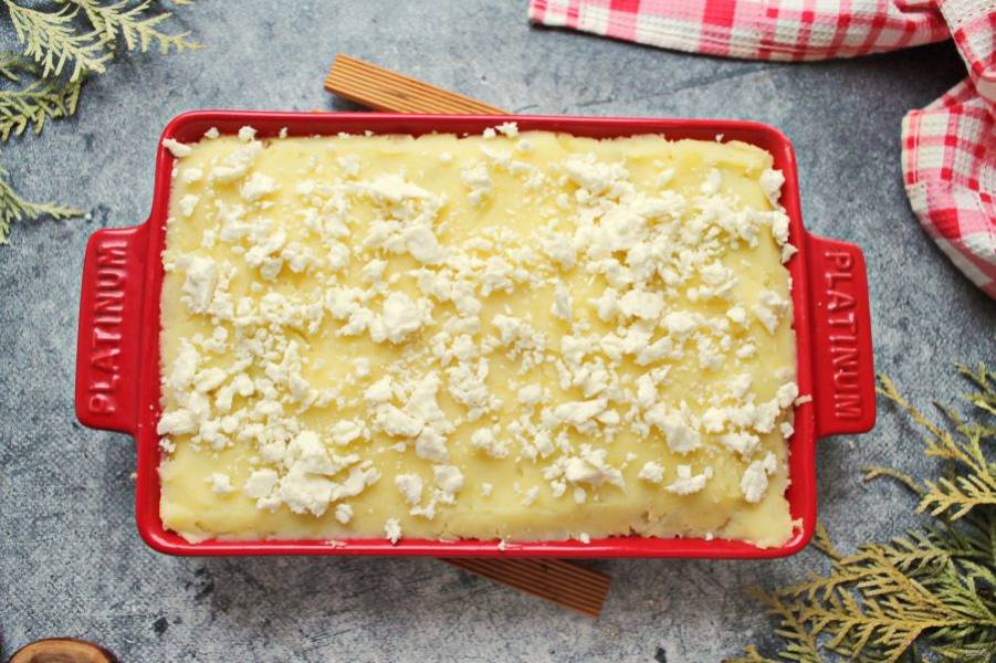 Оставшимся картофельным пюре закройте вверх запеканки по всей поверхности ровным слоем. Посыпьте сверху брынзой, которая осталась.