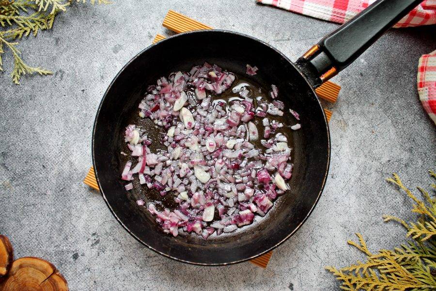 Репчатый лук и чеснок почистите. Мелко порежьте. В сковороду влейте растительное масло и разогрейте его. Выложите репчатый лук в сковороду и обжаривайте в течение 5 минут, перемешивая.