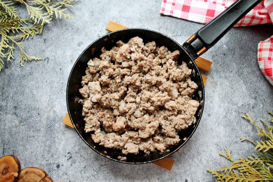Добавьте к обжаренному луку фарш. Все посолите, поперчите и обжаривайте в течение 10-12 минут, перемешивая.