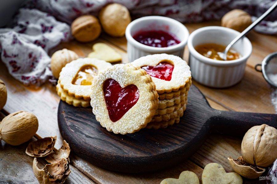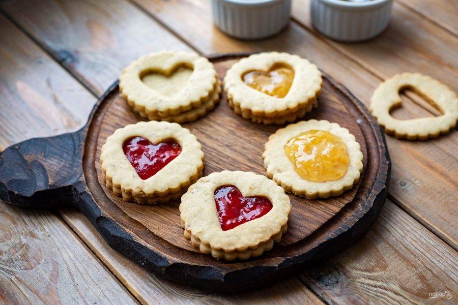 Остудите готовое печенье до комнатной температуры и приступайте к сборке: на один печенье-кружочек выложите 1 ч.л. джема, сверху выложите второй кружочек-печенье с выемкой. Так соберите все печенье.