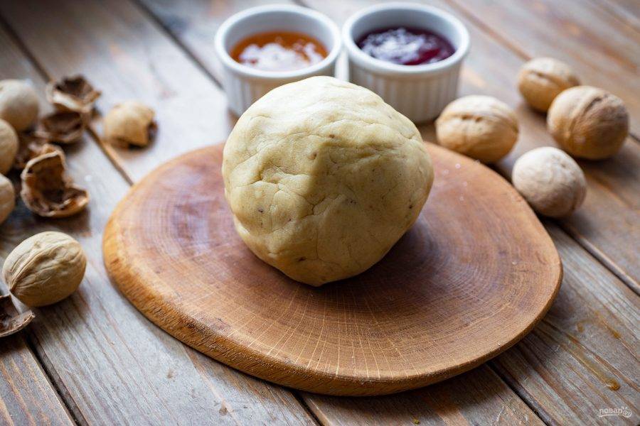 Замесите руками очень мягкое, эластичное тесто. Округлите тесто в шар, оберните в пищевой полиэтилен и положите на полку холодильника на час.