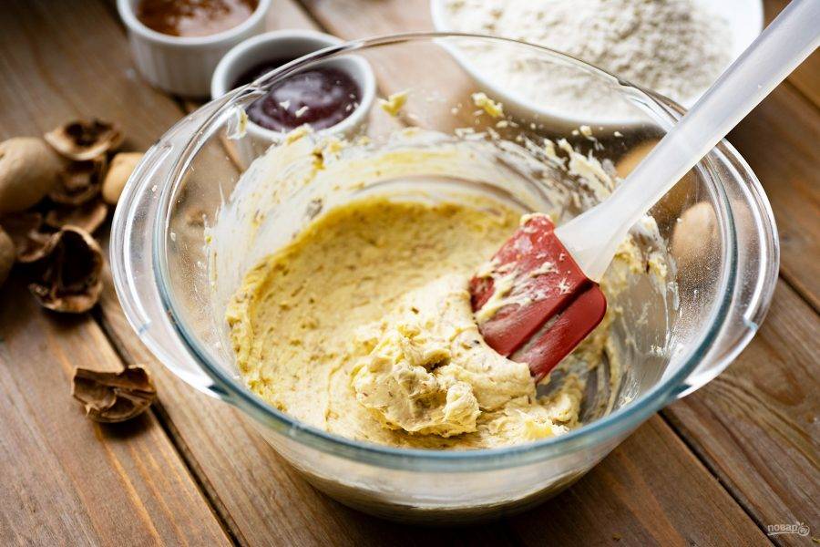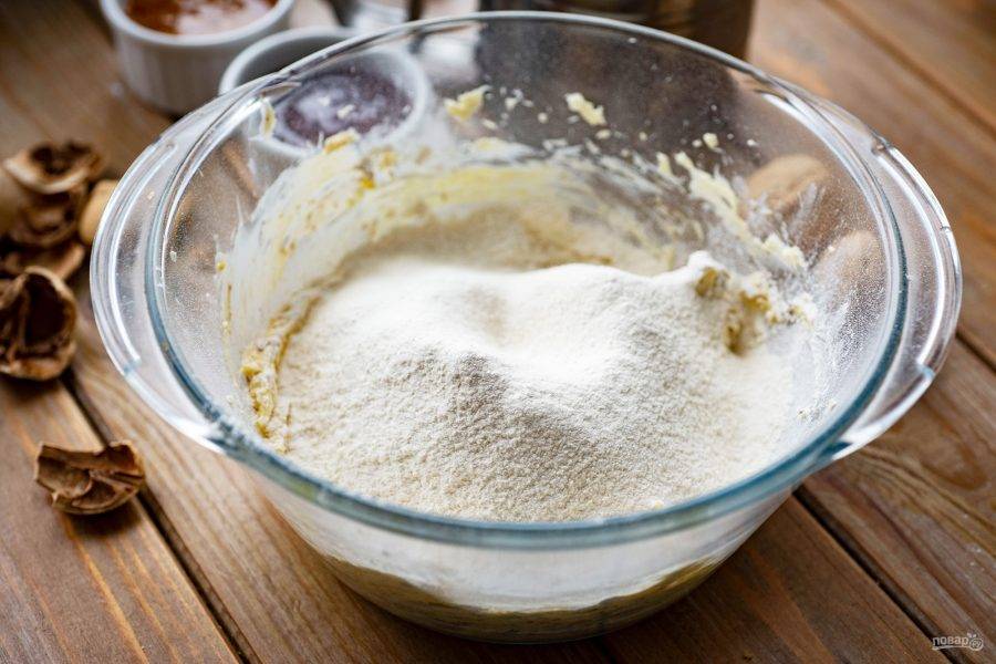 К полученной однородной массе просейте муку с разрыхлителем, добавьте щепотку соли.