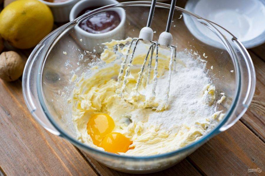 Ко взбитому маслу добавьте сахарную пудру и яичные желтки. Взбивайте миксером эти ингредиенты до получения однородной смеси.