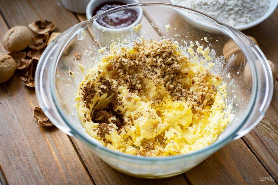 Ядра грецких орехов слегка обжарьте до легкого золотистого оттенка на сухой сковороде и измельчите удобным способом: можно порезать ножом, а можно выложить в чашу блендера и запустить устройство на 15-20 секунд. Добавьте измельченные грецкие орехи в миску к остальным ингредиентам, также добавьте цедру лимона и корицу.
