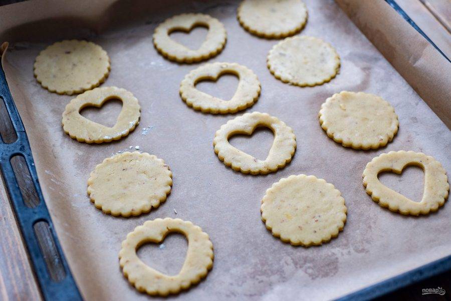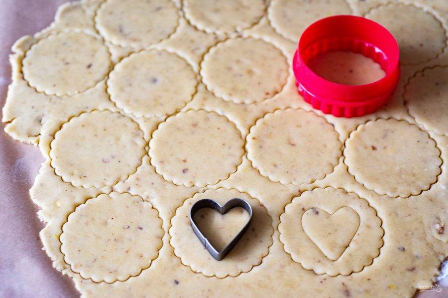 Затем охлажденное тесто раскатайте скалкой на рабочей поверхности в пласт толщиной примерно в 2 мм. Вырубите круглой формочкой четное количество кружочков (диаметр 5-7 см.). В половине кружочков из теста вырубите дополнительно выемки – у меня такие выемки в форме сердечек.