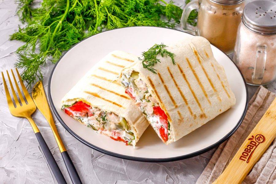 Аккуратно сверните край лаваша и его боковые края, заверните его рулетом, не сильно прижимая начинку, чтобы не порвать тесто. По желанию таким же образом сделайте еще одну заготовку, если готовите на двух человек.