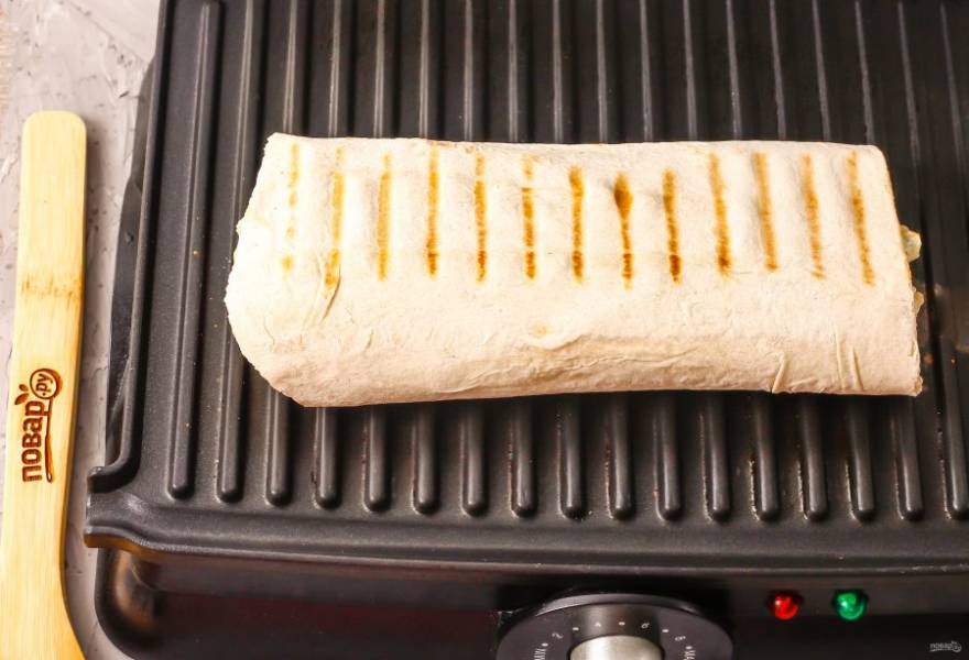 Прогрейте гриль или пресс-гриль, выложите на панели заготовку и поджарьте ее до румяности примерно 2-3 минуты на высокой мощности техники.