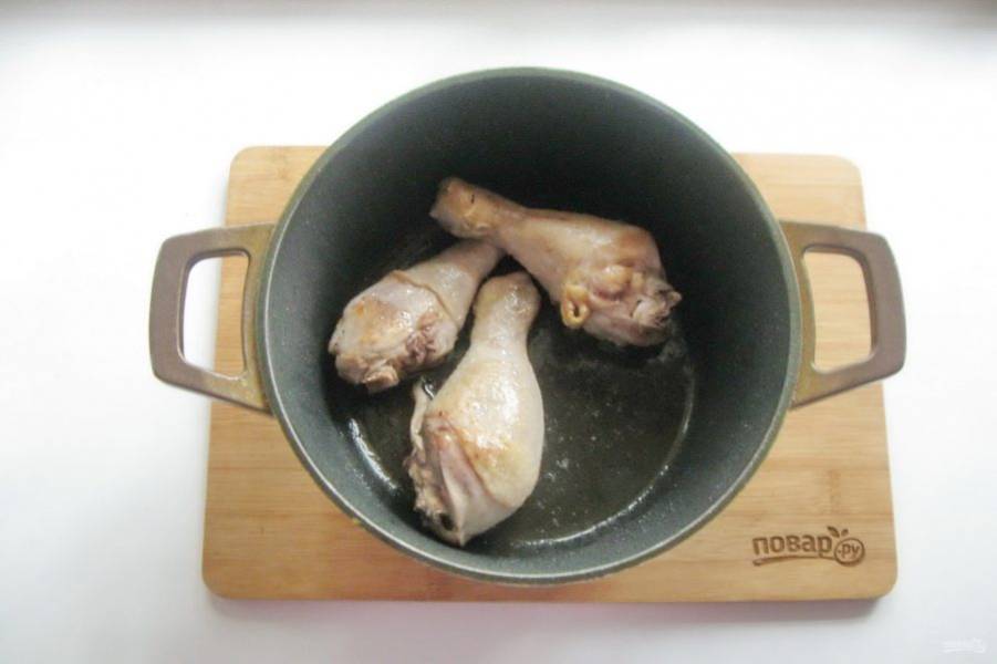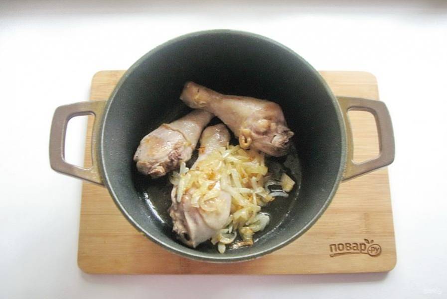 Налейте воду, посолите и поперчите по вкусу. Варите курицу на небольшом огне 15 минут.