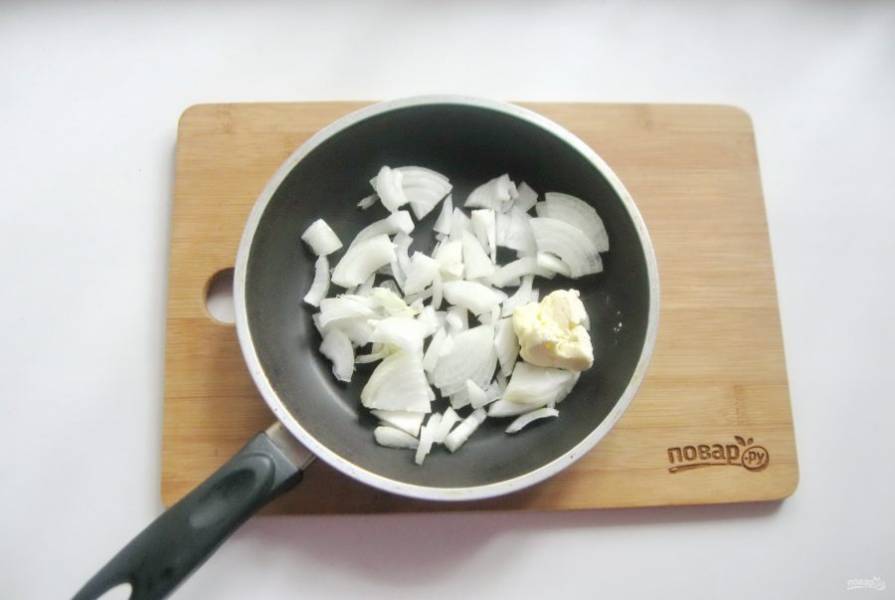 Репчатый лук очистите, помойте и мелко нарежьте. Выложите в сковороду, добавьте кусочек сливочного масла.