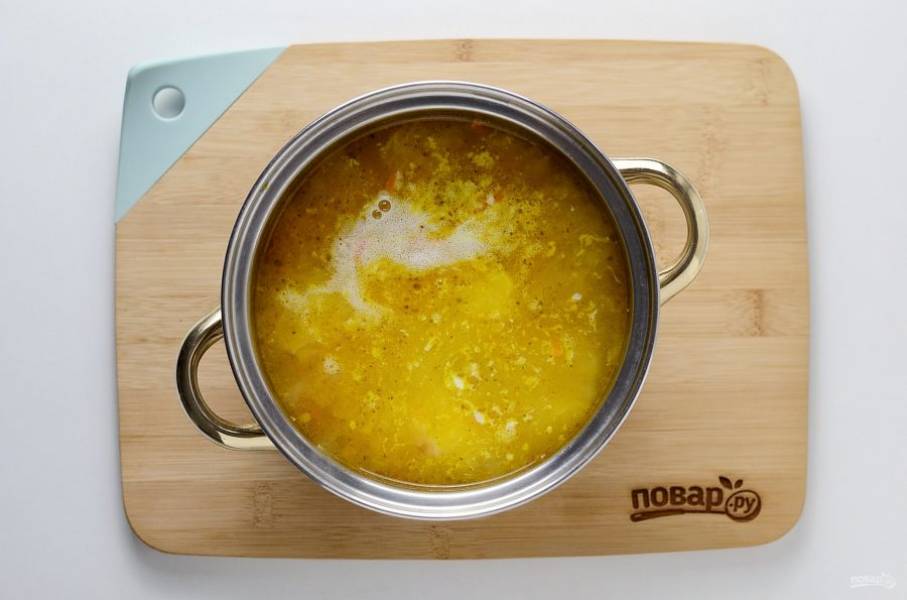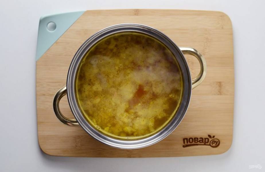 Переложите зажарку в кастрюлю. Влейте овощной бульон, посолите и доведите до кипения.