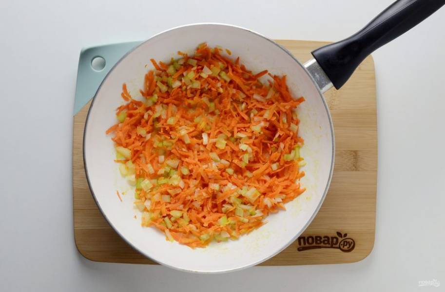 Лук и сельдерей нарежьте кубиками, морковь натрите на крупной терке. Обжарьте в небольшом количестве масла до мягкости.