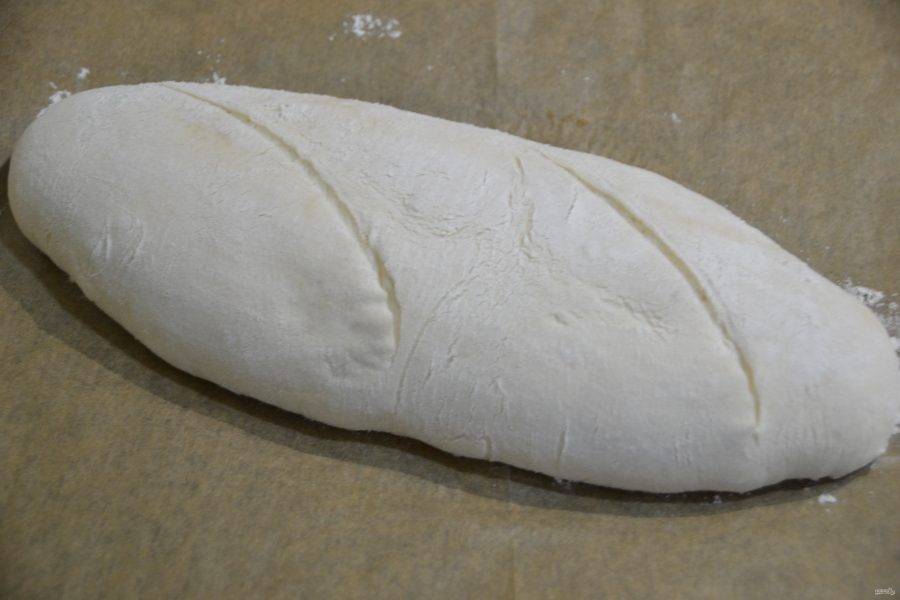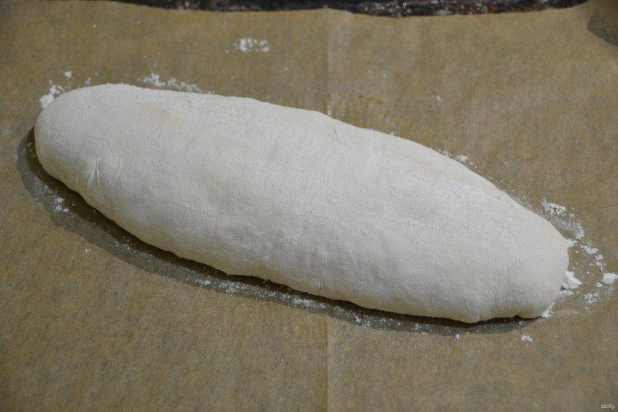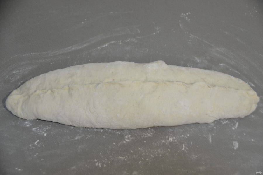 Далее сделайте еще один оборот теста, сформировав батон, подкатайте, защипните шов.