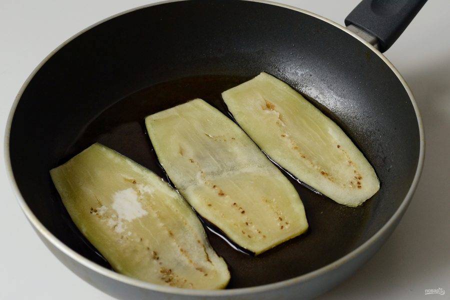 Обжарьте баклажаны в большом количестве масла до золотистой корочки.