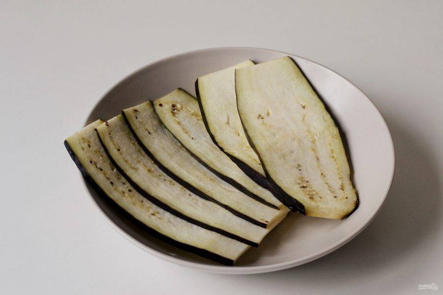 Баклажаны нарежьте вдоль полосками толщиной 2 мм. Залейте водой и подсолите. Оставьте на 10 минут, чтобы ушла вся горечь.