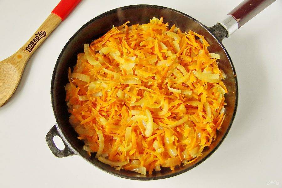 Лук нарежьте перьями, морковь натрите на терке. Обжарьте лук и морковь на сковороде до мягкости.