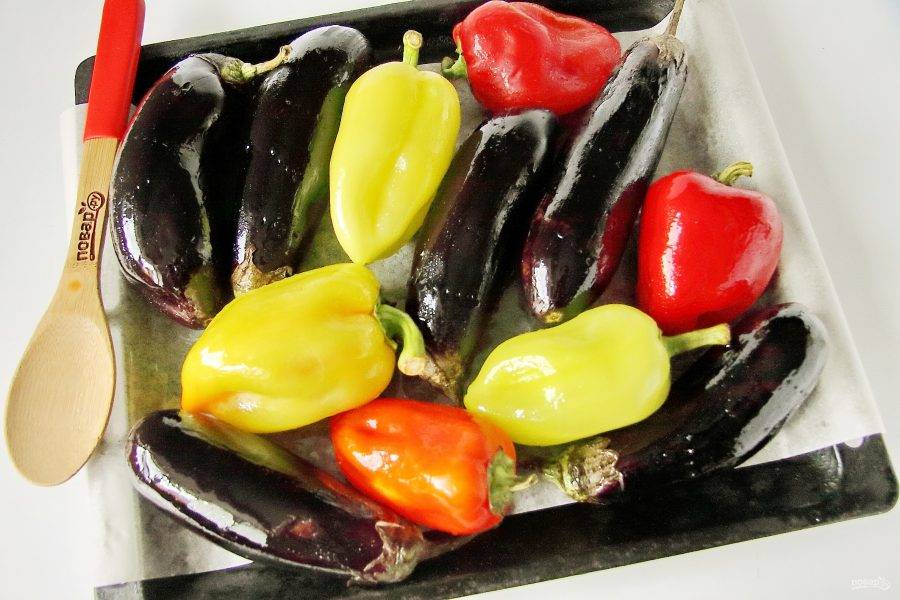 Противень застелите пергаментом или фольгой, смажьте маслом и выложите в один ряд перец и баклажаны. Баклажаны наколите вилкой в нескольких местах. Смажьте овощи при помощи кулинарной кисти растительным маслом и отправьте в разогретую до 200 градусов духовку. Запекайте до полной готовности. В процессе овощи необходимо перевернуть один раз.