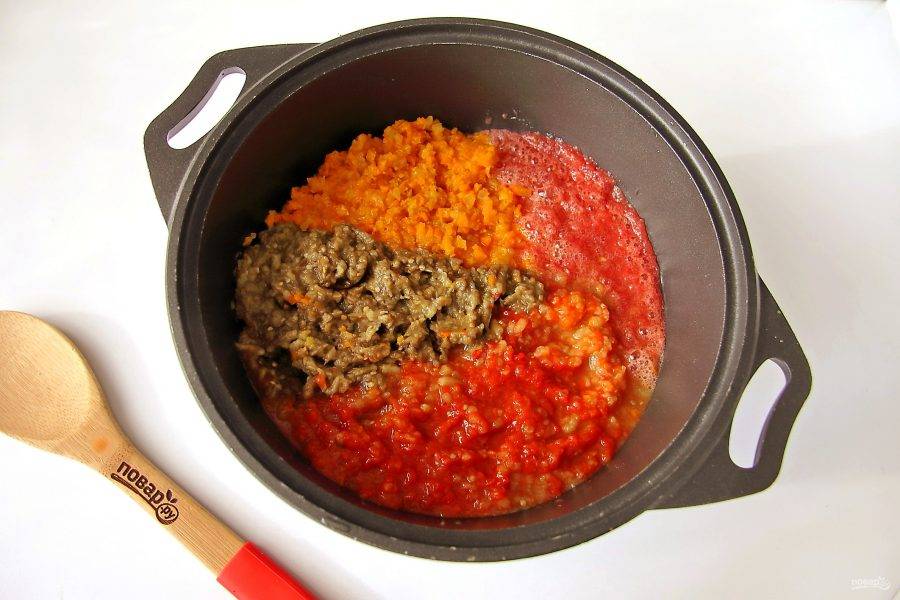 У перцев снимите шкурку и удалите семенную коробку. Баклажаны так же очистите от шкурки. Все подготовленные овощи кроме чеснока, прокрутите через мясорубку: перец, баклажаны, помидоры, лук и морковь. Тушите овощи под крышкой на небольшом огне 30 минут.