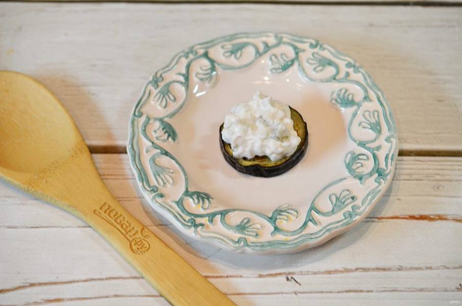 8. Выложите самый крупный кружок баклажана, смажьте его начинкой. Сверху положите кружок чуть меньше, затем еще начинку. И так соберите елочку из 5 кружков баклажана.