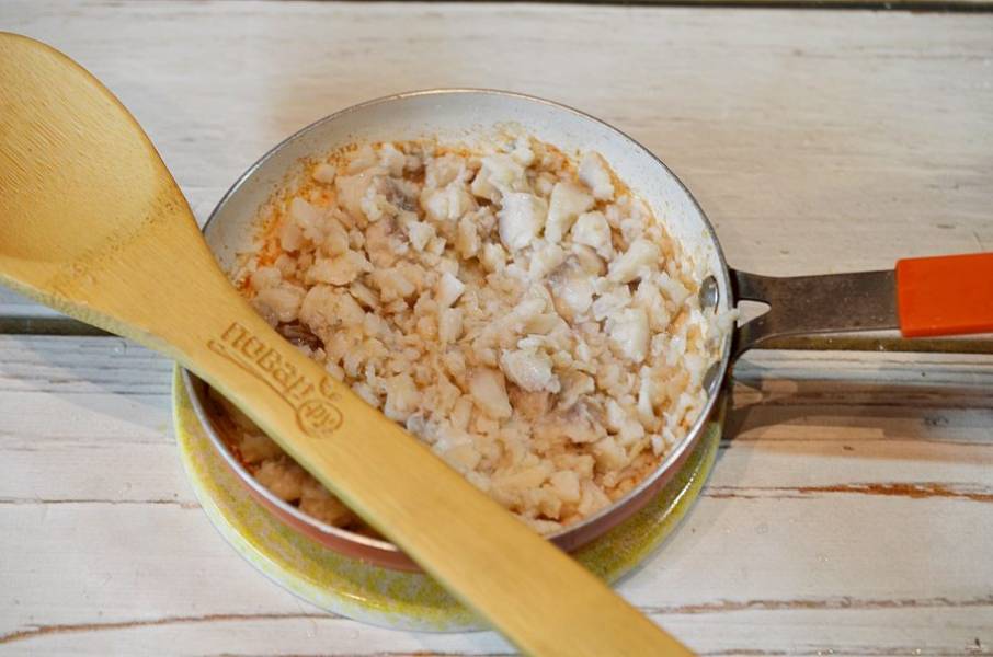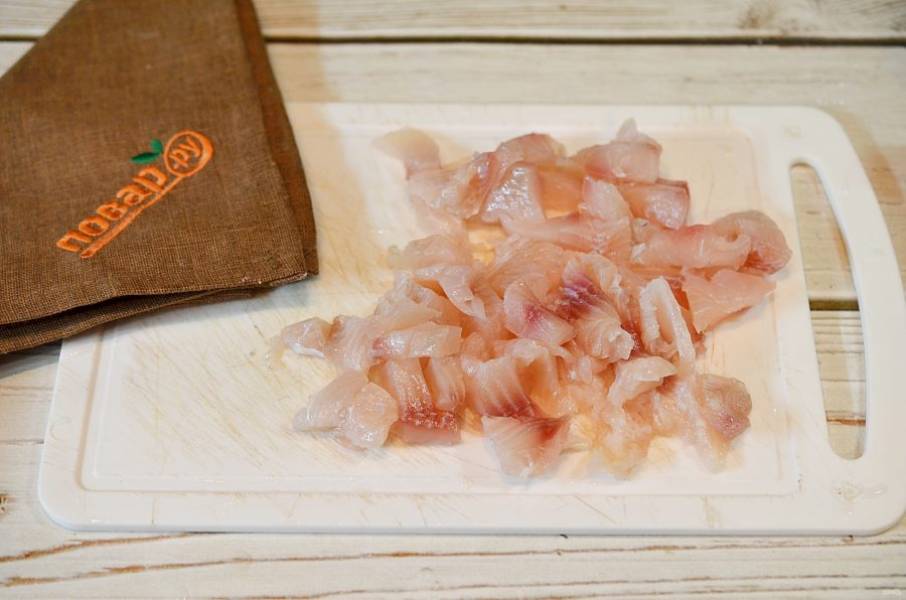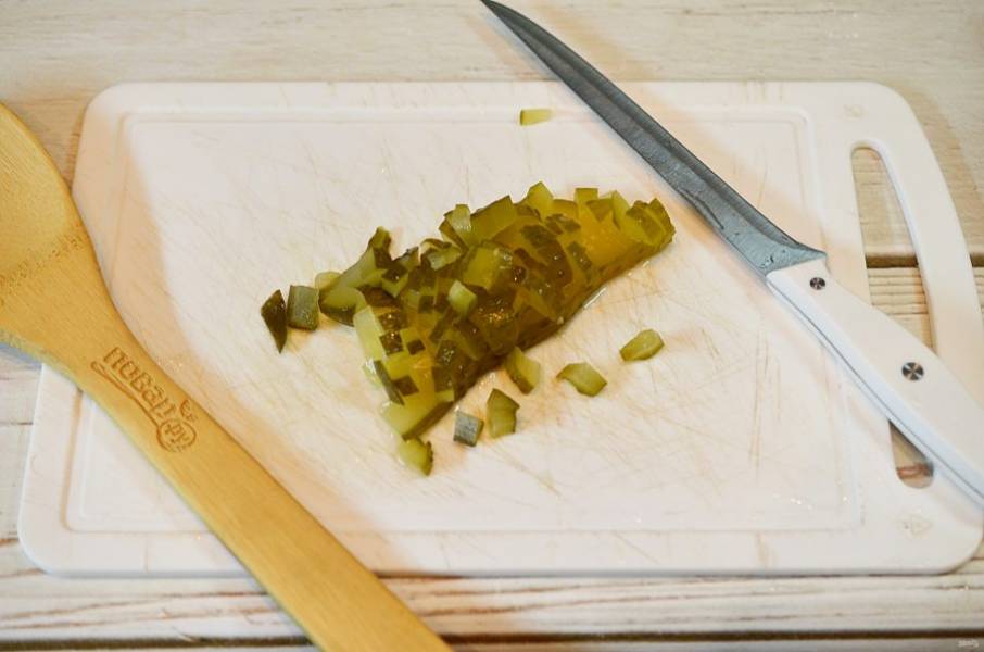 6. Охладите рыбу и баклажаны. Нарежьте мелко огурец.