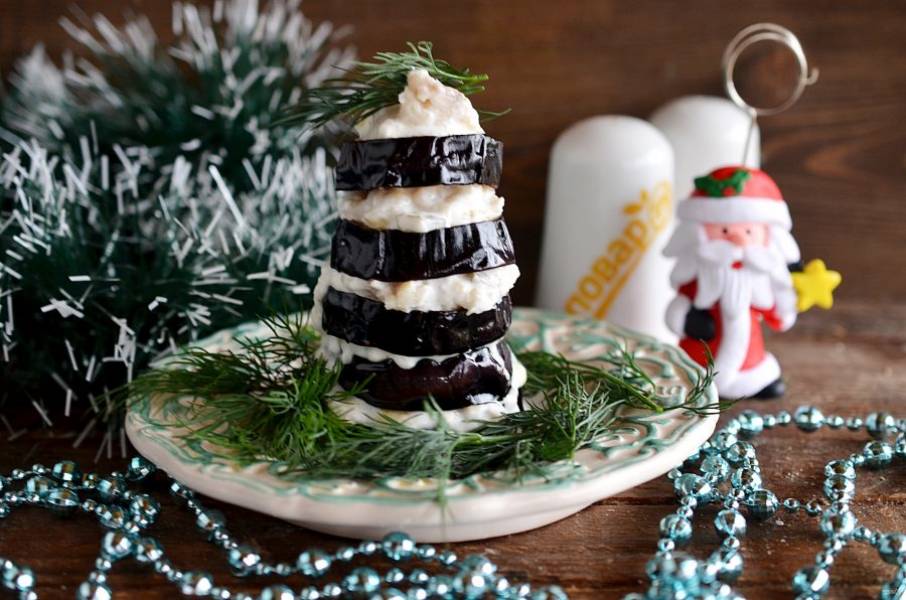 Я уже озадачилась новогодним меню. А вы уже подбираете рецепты для новогоднего стола?! Предлагаю оригинальную и вкусную закуску: баклажан с начинкой из жареной рыбы и сливочного сыра, оформленный в виде елочки.