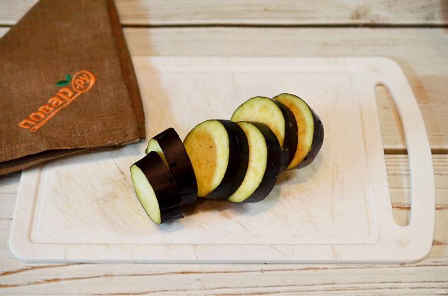 1. Баклажан помойте и нарежьте кружками толщиной в 1 см.