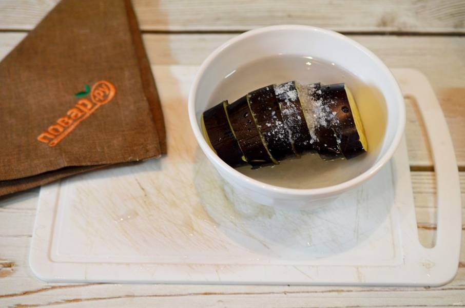 2. Опустите нарезанный баклажан в соленую воду и оставьте минут на 15, чтобы убрать лишнюю горечь.