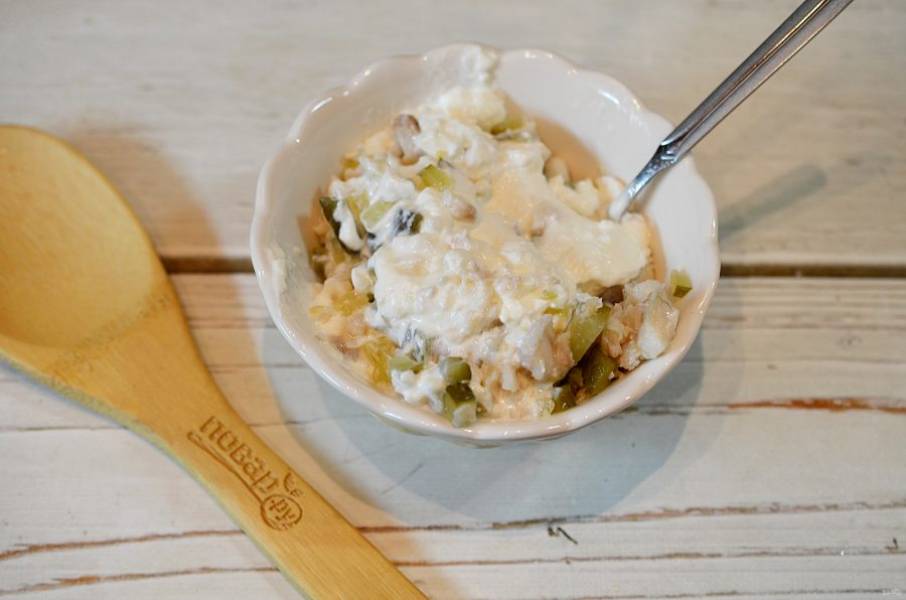 7. Соедините творожный сыр, рыбу и огурец. Перемешайте, посолите по вкусу.