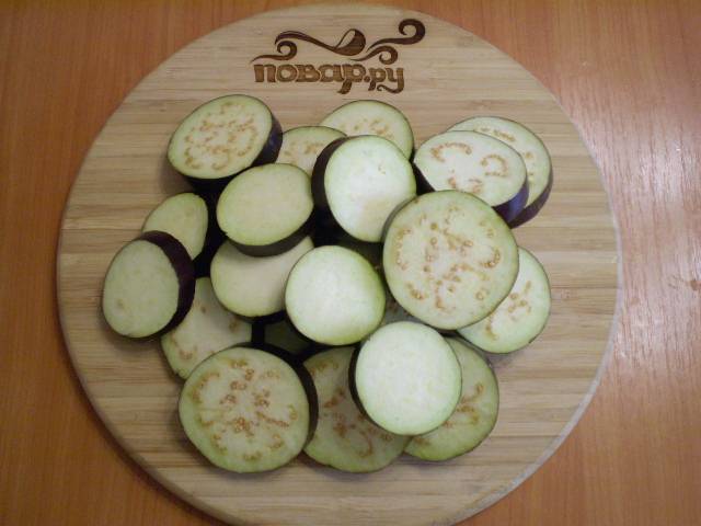 2. Вымытые баклажаны режем кружочками. Толщина кружочков должна быть одинаковой, чтобы баклажаны одинаково приготовились.