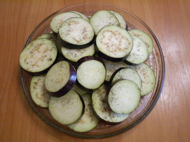 3. Солим и перчим все кружочки, отставляем на 10 минут. Когда образуется сок, сливаем его. Это делается для того, чтобы баклажаны потеряли горечь.