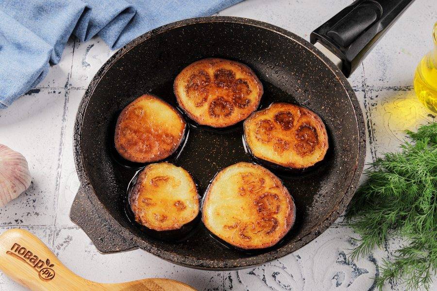 Разогрейте сковороду с растительным маслом и обжарьте кружочки поочерёдно с обеих сторон, на умеренном огне, до румяной корочки. Обжаренные баклажаны выложите на бумажное полотенце, чтобы убрать излишки масла.